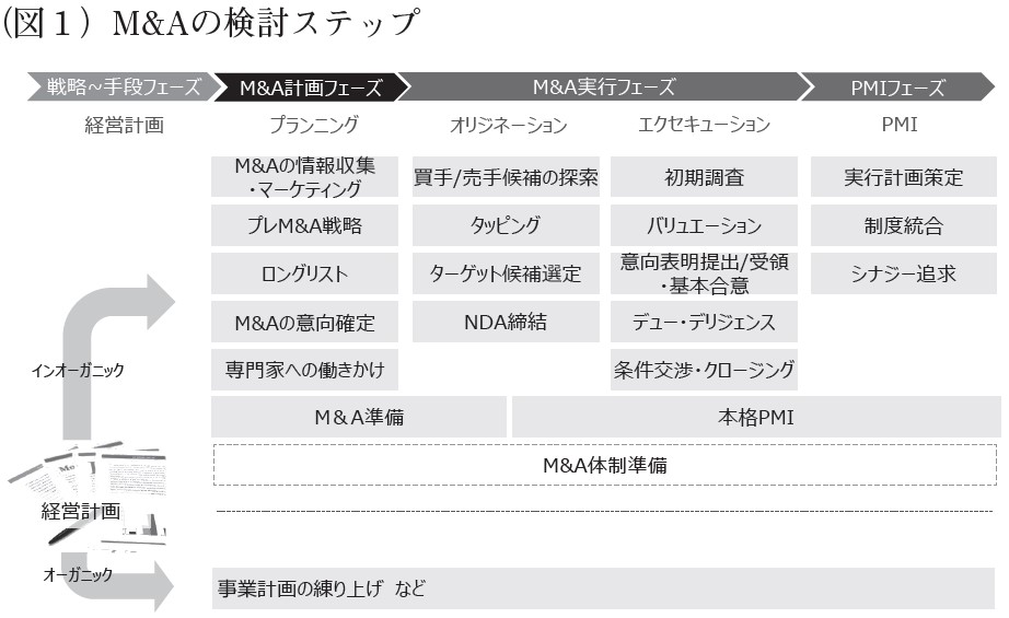 M&A件数が増加する一方、当初の目的や期待した効果が達成できなかった理由として、「経営統合に向けた自社の準備不足」が上位となるアンケート結果があるように、目的を達成するM&Aには検討ステップ(図1参照)の準備にあたる「プランニング」がポイントと捉えられる。