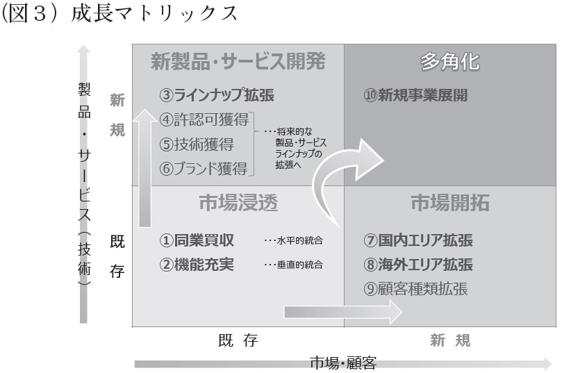 プロジェクトチームは改めて中期経営計画を確認することで、M&Aの目的について共通認識を取ることから始めた。まずは事業ポートフォリオ分析(図2参照)に基づいて各事業の成長の方向性仮説を整理し、成長マトリックス(図3参照)に照らして改めて成長手段を具体化するアプローチをとった。
